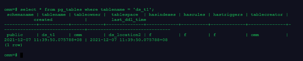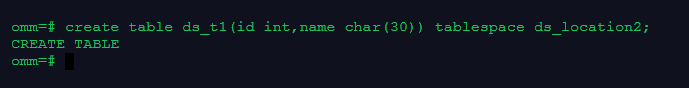 create table ds_t1(id int, name char(30)) tablespace ds_location2;