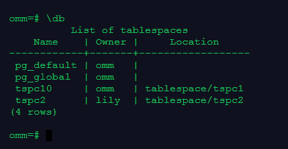 3.重命名tspc1,修改tspc2的用户为Lily,使用\db查看表空间信息