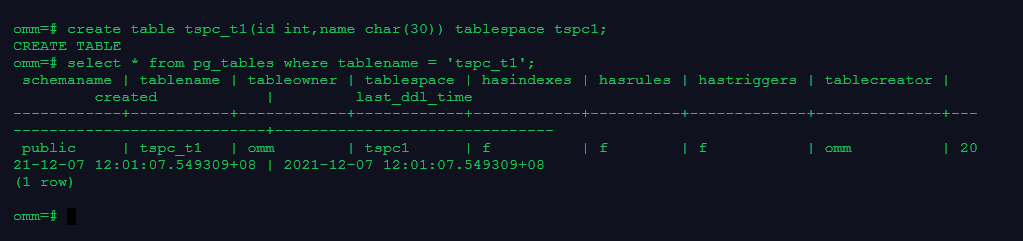 create table tspc_t1(id int,name char(30)) tablespace tspc1;select * from pg_tables where tablename = 'tspc_t1';