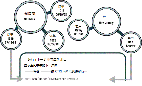 相反,当查询数据库时,使用模型定义的条件,可以带着如下问题来查询数据库, “New Jersey的客户 Shimara 公司生产的产品下了哪些装运日期在第三季度的订单?” 下图显示了此类查询。