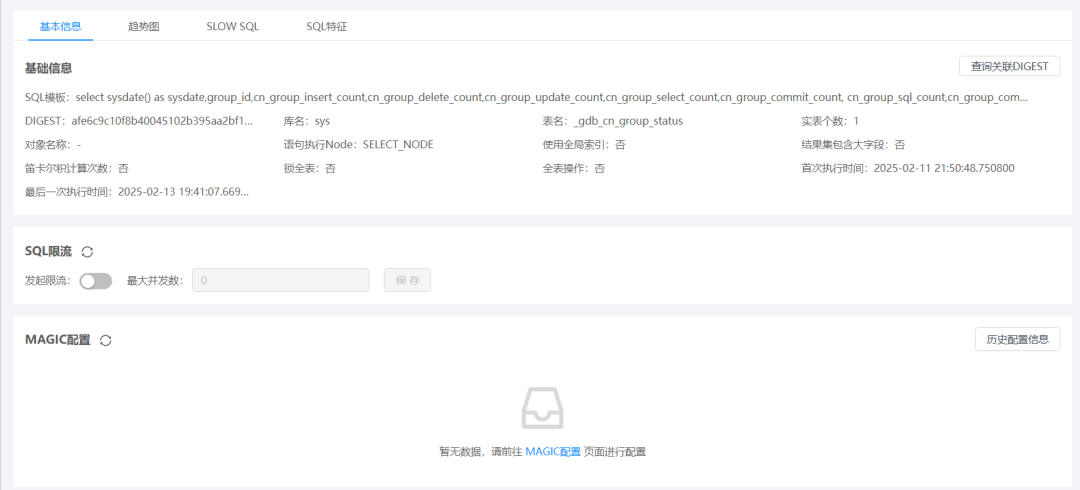 基础信息板块对该SQL的关键要素进行了细致呈现,除了SQL模版、DIGEST等SQL标记信息外,还包含语句执行所涉及的Node、是否启用了全局索引,以及结果集中是否存在大字段等与语句执行密切相关的信息。这些翔实且全面的基础信息,能够助力用户快速识别诸如全表锁定等典型问题。一旦发现问题,用户便可及时采取应对措施,果断发起SQL限流操作,或者进行精准的MAGIC配置。