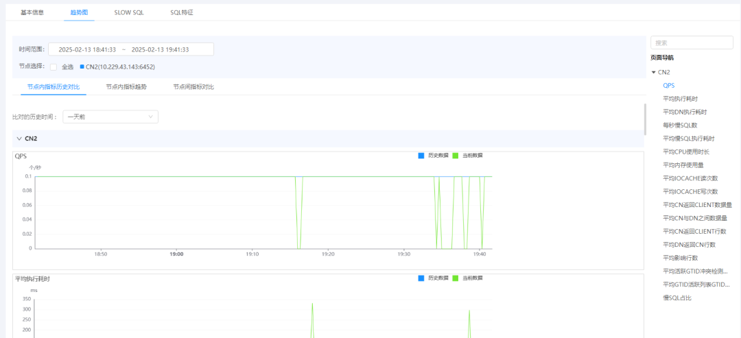 在趋势图标签页,用户能够根据自身需求,灵活且精准地选择想要查看的时间范围,从而对数据进行细致入微的分析。Insight运维平台充分考量用户的多样化需求,精心提供了三种不同类型的趋势图,分别为节点内指标历史比对图、节点内指标趋势图以及节点间指标对比图,这里的节点指的是统一类型的组件,如CN节点、DN节点,全方位满足用户多维度的分析诉求。