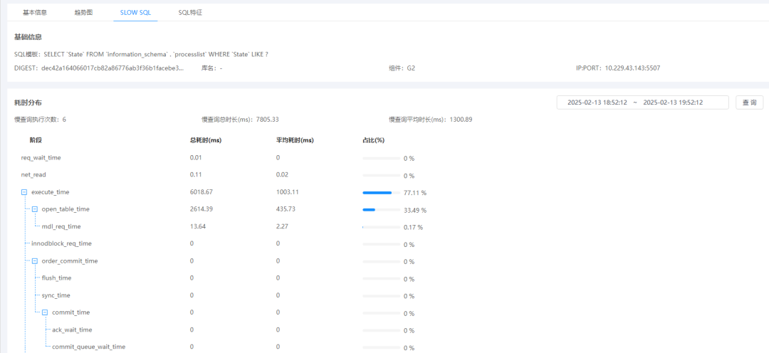 当用户通过趋势图或者SQL诊断中的SLOW SQL功能,察觉到某条SQL属于慢SQL时,可点击相应标签页,查看该SQL的耗时分布情况。通过这一耗时分布,用户能够清晰直观地了解到该SQL在各个执行阶段的耗时占比。