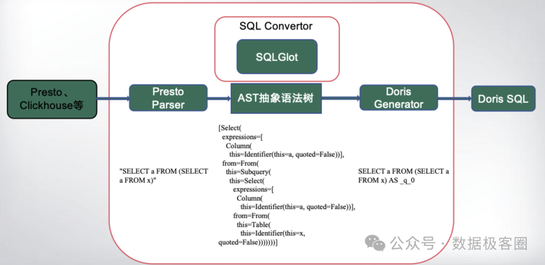 Doris 通过独特的解析器和优化器设计,实现对多种 SQL 方言的支持。当用户提交一条 SQL 查询时,解析器会首先对查询语句进行词法和语法分析,将其转化为抽象语法树(AST)。在这一过程中,解析器能够识别不同方言的语法结构,并进行相应处理。