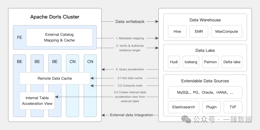 Doris 通过多源数据目录(Multi-Catalog)功能,支持了包括 Apache Hive、Apache Iceberg、Apache Hudi、Apache Paimon、LakeSoul、Elasticsearch、MySQL、Oracle、SQL Server 等主流数据湖、数据库的连接访问。以及可以通过 Apache Ranger 等进行统一的权限管理。