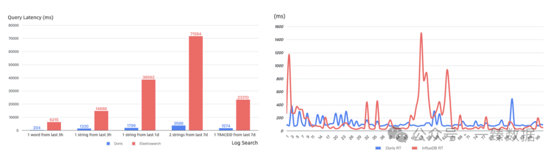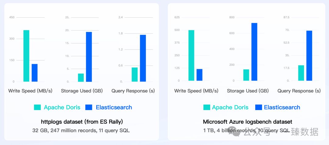 在 Elasticsearch httplogs 和 Microsoft Azure logsbench 日志存储分析基准测试中,Doris 的查询性能是 Elasticsearch 的 3 倍以上,写入性能为其 3 ~ 4 倍,存储空间需求仅为 Elasticsearch 的 1/6 ~ 1/4。