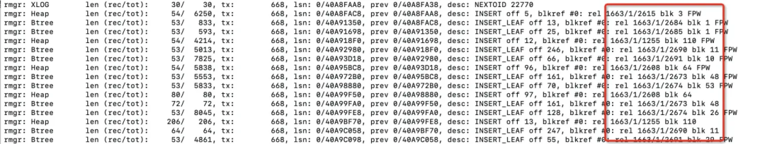 下图为wal日志通过pg_waldump解析的结果,从解析结果可知,wal record会记录db修改的每一个block。因此,可以通过解析wal日志的每一条record,从中找出block变化的信息,并记录下来。