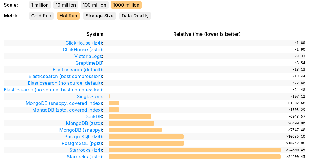 与其同时,GreptimeDB 在 ClickHouse 官方推出的 JSONBench[1]中的表现验证了其处理海量数据集的竞争力,性能与 ClickHouse 和 VictoriaLogs 处于同一梯队。10 亿级别的 Cold Run 斩获第一,Hot Run 前四: