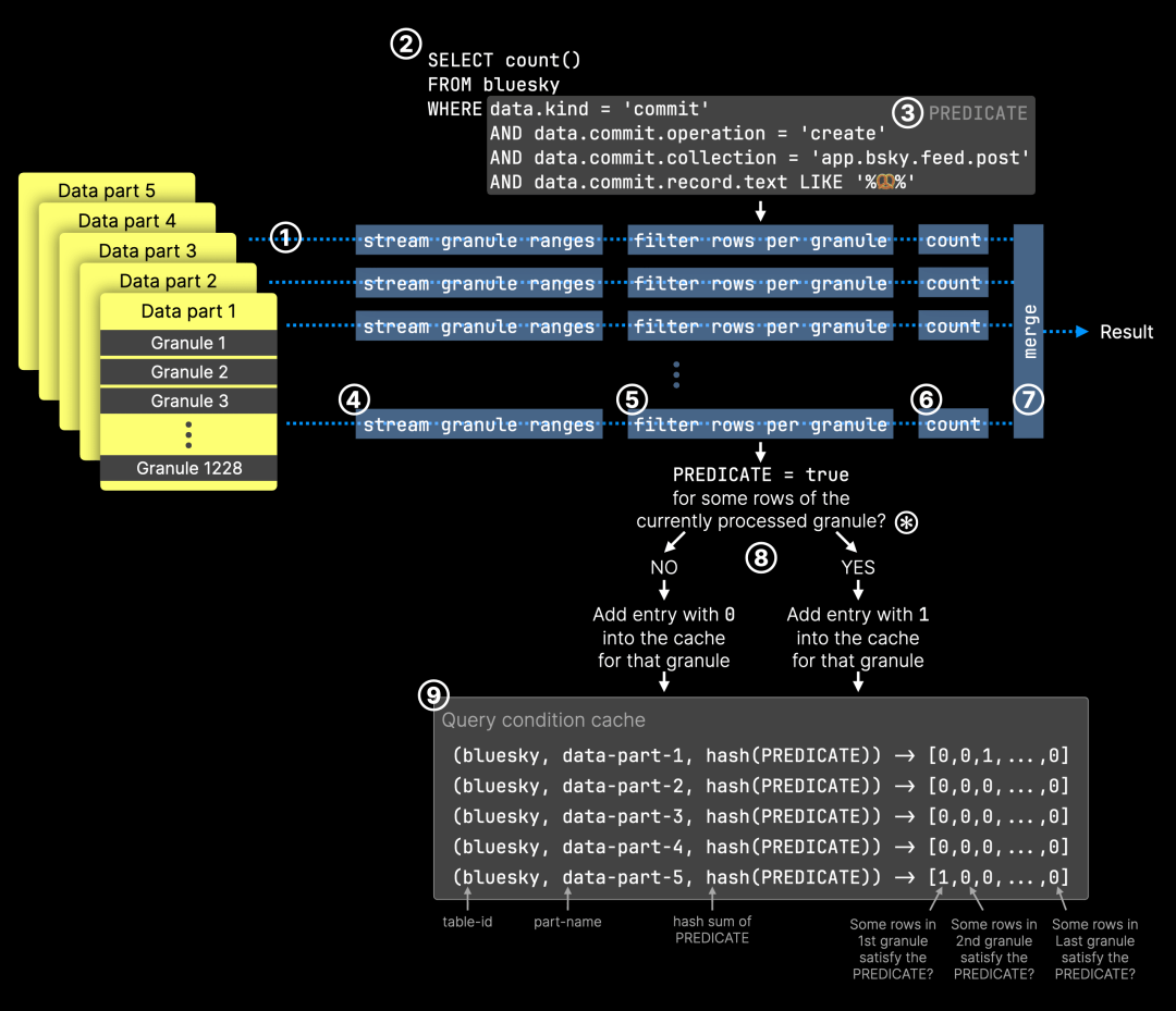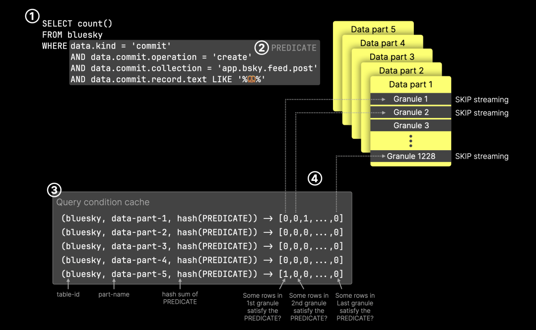 ① <Trace> ...: Filtering marks by primary keys...② <Debug> QueryConditionCache: Read entry for table_uuid:6f0f1c9d-3e98-4982-8874-27a18e8b0c2b, part: all_1_6_1,condition_hash: 10479296885953282043, ranges: [0,0,...]...② <Debug> ...: Query condition cache has dropped 11970/12138 granules for WHERE condition and(equals(data.kind, 'commit'_String), equals(data.commit.operation, 'create'_String), equals(data.commit.collection, 'app.bsky.feed.post'_String), like(data.commit.record.text, '%🥨%'_String))....③ <Debug> ...: 168 marks to read from 73 ranges④ <Trace> ...: Spreading mark ranges among streams④ <Debug> ...: Reading approx. 1376256 rows with 18 streams