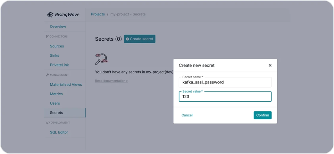 网络指标仪表盘|图源:RW 密钥管理(Secret Management):密钥管理是 RisingWave SQL 中用于保护外部连接和防止凭据泄露的关键功能。此前仅能通过 SQL 使用的密钥管理功能,现在也可在 Cloud Portal UI 中访问,让您轻松创建和管理密钥。