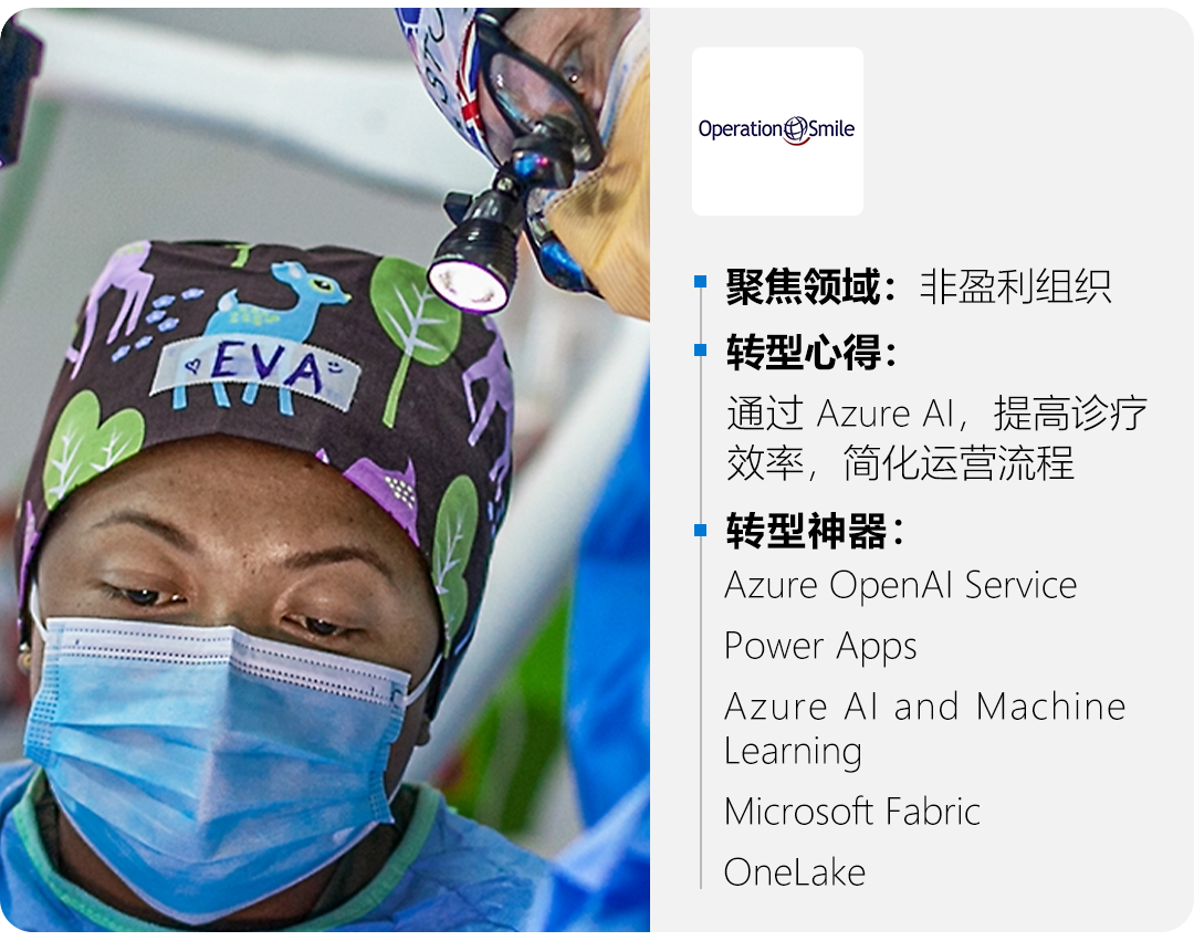 Operation Smile 医疗质量副总裁 Bryan Zimmerman 博士表示:“我们过去一直依赖手动处理电子表格分析全球数据,这一过程既繁琐又低效。Azure AI 解决方案的引入让我们大幅提升了工作效率,简化了操作流程。”