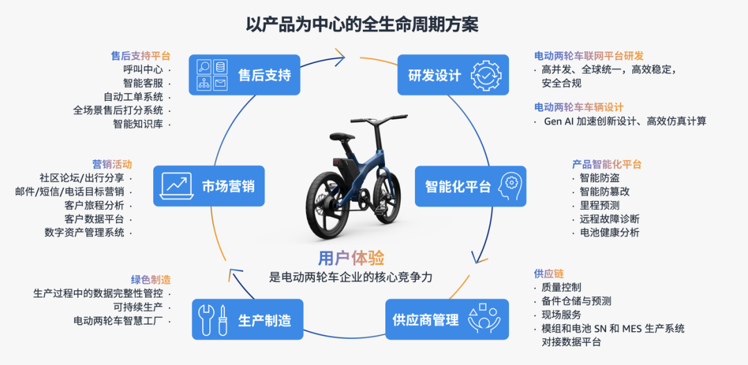 亚马逊云科技致力于以智能电动两轮车为载体,以云计算、物联网、人工智能技术为引擎,打造人、车、生活的和谐整体。通过一系列创新的解决方案,亚马逊云科技助力电动两轮车企业实现数字化转型,提升产品智能化水平、优化生产流程、增强客户体验,并推动行业的可持续发展。