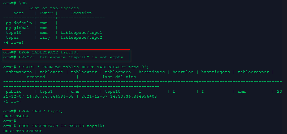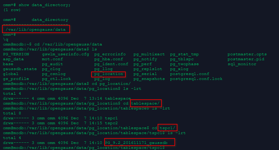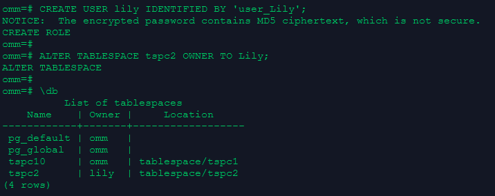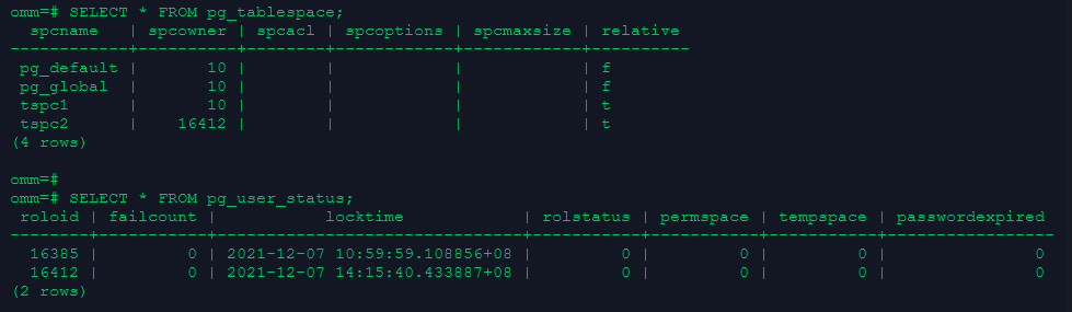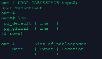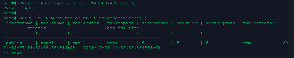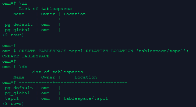 CREATE TABLESPACE ds_location2 OWNER joe RELATIVE LOCATION 'tablespace/tablespace_2';–查看表空间信息