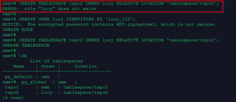 1.创建表空间,表空间tspc1使用相对路径指定所在目录,表空间tspc2指定owner为Lucy