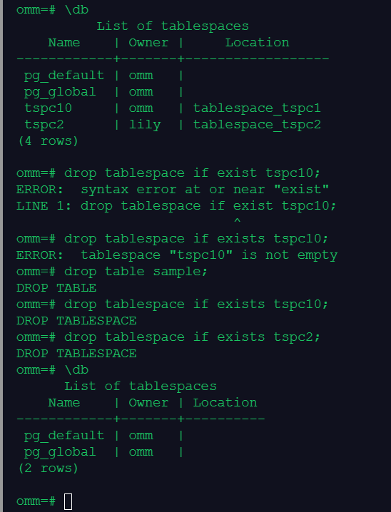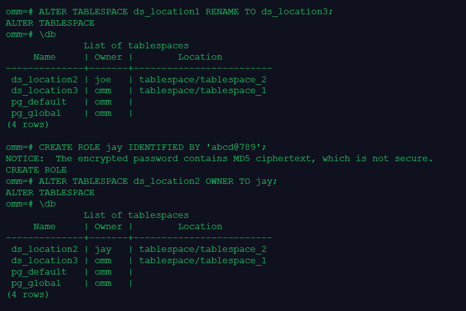 create tablespace tspc2 owner Lucy relative location 'tablespace_tspc2';