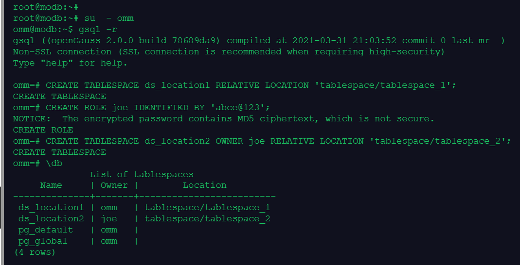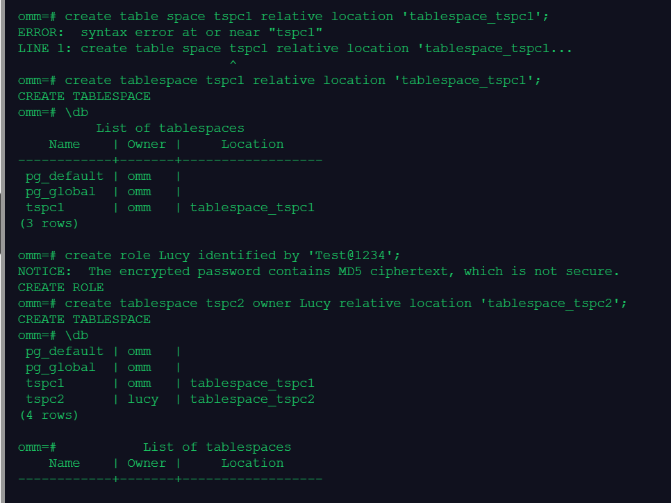 1.创建表空间,表空间tspc1使用相对路径指定所在目录,表空间tspc2指定owner为Lucy