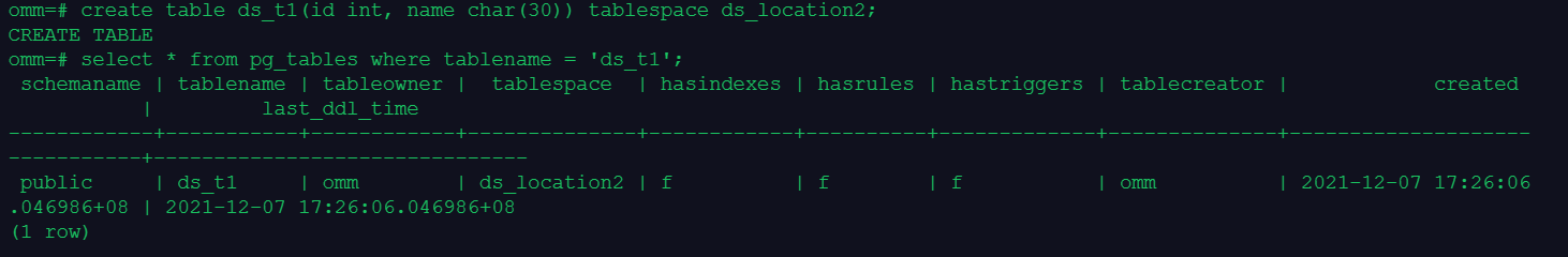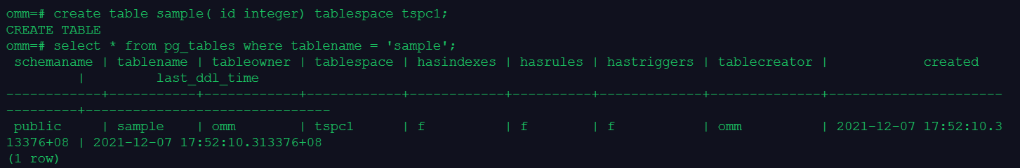 2.在表空间tspc1中建表,并使用视图pg_tables查看信息