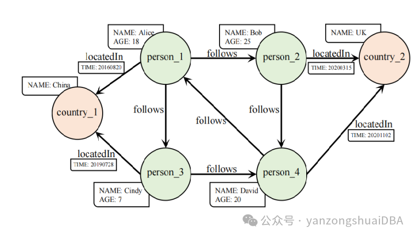 属性图模型:点和边上可以处理各种属性。如上图所示,点和边分配了一个类型,例如person(点)、country(点)、follows(边)、locatedIn(边)以及一组属性,比如NAME:ALICE and TIME:20201102。