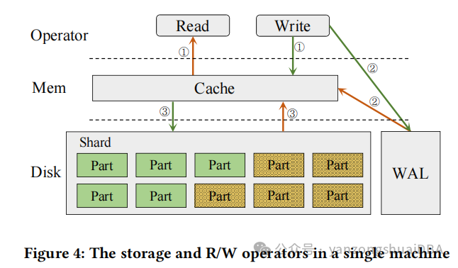 写操作:绿色箭头展示了写流程,首先数据会写到cache和WAL到磁盘:cache提高了读写效率,WAL确保数据一致性。当数据的WAL持久化到磁盘,并且数据更新到cache后就认为写完成了。当缓存中的数据满足驱逐标准时,异步、顺序、批量写到shard的partition中