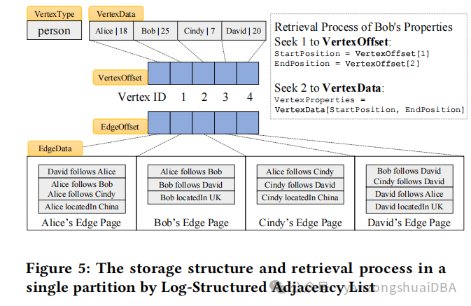 Partition中处理Log-Structured Adjacency List(日志结构邻接表),将点和表作为邻接表,并存储多版本数据,最后将数据批量写回磁盘;Page级别部署了Edge Page结构,在图遍历和单边查询等基本操作中实现高性能。