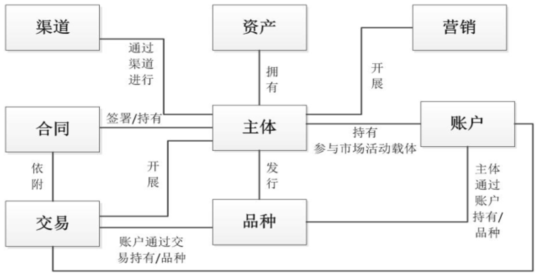 最高层级的数据模型(源自业务模型/业务过程模型),以主题概念及其之间的关系为基本单元所构成的模型。主题域(Subject)是一个抽象概念,是在较高层次上将企业信息系统中的数据综合、归类并进行分析利用的抽象。主题域并非简单的对企业数据进行分门别类(如按业务线、按系统等),一般是对行业业务过程所涉及关键业务对象抽象概括而来(基于MECE原则,Mutually Exclusive Collectively Exhaustive,即相互独立、完全穷尽),并反映了真实的业务关系,由此可保障数据模型骨干结构的稳定性。一个典型证券行业主题域模型如下图所示: