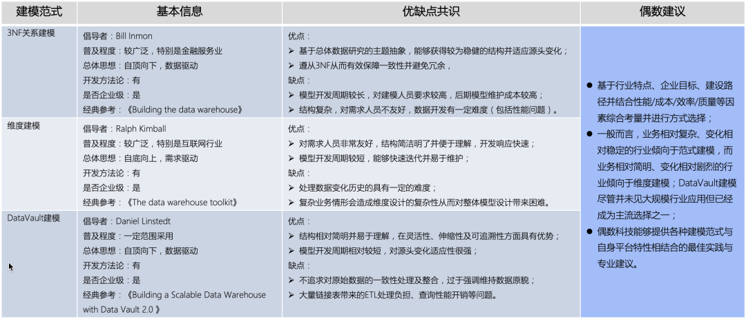 如前文所述,偶数建议的数据分层架构为包含着陆层、整合层、交付层在内的三层数据架构,其中对于整合层数据的模型选择来说,存在3NF关系建模、维度建模、DataVault建模等不同的选择。