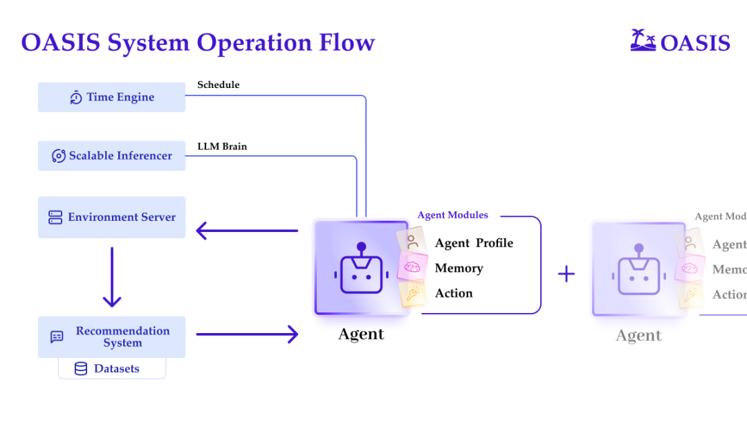 OASIS 的系统由五大核心模块协同运行,每一部分都对应着现实社交平台的关键机制: