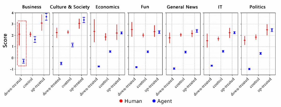 我们在模拟中设置了不同场景,将部分帖子提前进行“虚拟点赞”或“虚拟点踩”,以模拟现实中用户可能受到的从众行为倾向。通过将这些模拟结果与人类行为数据对比,我们发现智能体比人类更容易受到从众效应的影响——也就是说,它们更容易被他人的观点所左右。