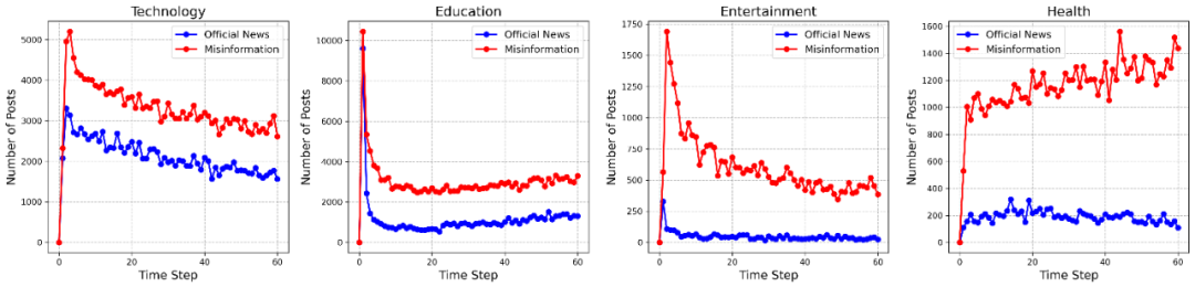 我们发现,虚假信息在数量上始终超过官方消息。在传播初期,用户对新话题的迅速反应使得二者扩散速度相当;但随着时间推移,官方消息的传播势头明显减弱,而虚假信息则能持续活跃、更长时间地流传。这一结果表明,虚假信息往往具有更强的“滞留效应”——即使其他话题逐渐消退,它仍然能够在平台上不断循环传播。
