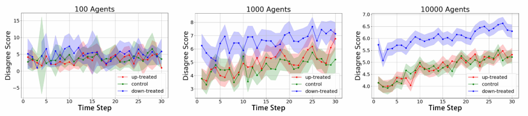 我们在 Reddit 模拟环境中引入了大量反事实内容(counterfactual posts),并在不同智能体规模下分析了从众效应的表现。结果发现:智能体数量越多,群体行为趋势越明显。换言之,群体在行为上的一致性与规模成正比,行为模式更易于被观察和量化。