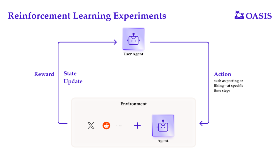 未来,OASIS 的潜力还可以通过 强化学习 进一步释放。举个例子:我们可以将不同社交媒体上的真实用户行为数据引入系统,并将其作为参考信号,对智能体的行为进行“奖励”——当某个智能体的行为更接近真实人类时,就给予正向反馈。这样一来,智能体会逐步学习如何表现得更像“真人”,其行为模式也将更加自然、可信。