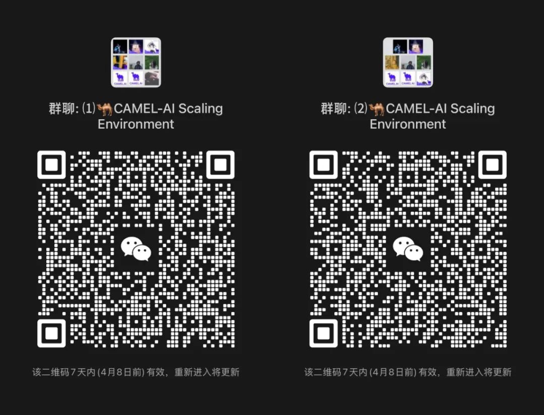 加入CAMEL微信群,请添加CAMEL官方微信号CamelAIOrg,会有工作人员通过您的好友申请并邀请您加入我们的微信群~