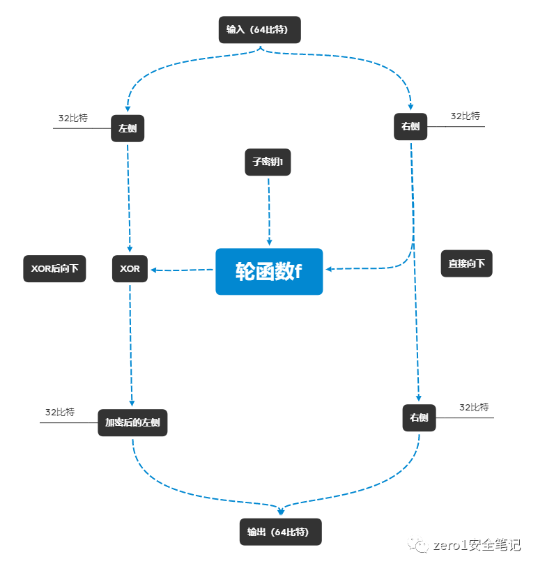 DES结构称为Feistel网络(由Horst Feistel设计)在Feistel网络中,加密的各个步骤称为轮,整个加密过程就是进行若干次轮的循环,DES就是一种16轮循环的Feistel网络。下图为DES Feistel网络的一轮。