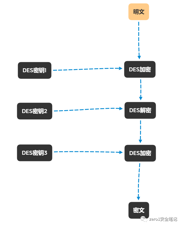 如果密钥1和密钥3相同,密钥2不同,称为DES-EDE2;如果三个密钥都不同就称为DES-EDE3,解密的过程和加密相反。