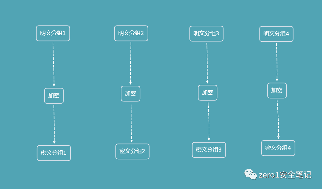 ECB模式全称是Electronic CodeBook mode(电子密码本模式),它是将明文分组加密后的结果直接成为密文分组,如下图