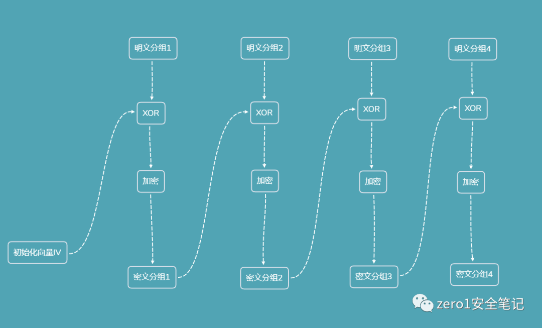 CBC模式全称为Cipher Block Chaining模式(密码分组链接模式),这个模式密文分组像链条一样相互链接在一起。CBC模式会将明文分组与前一个密文分组进行XOR运算,然后再进行加密,加密过程如下图