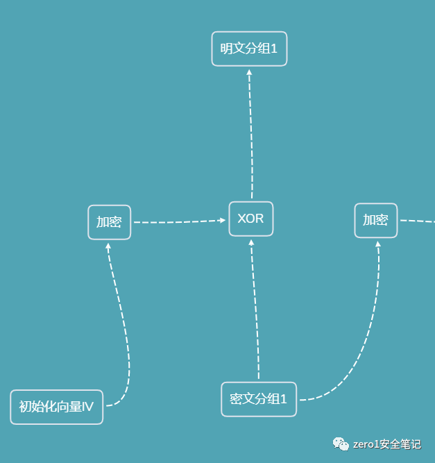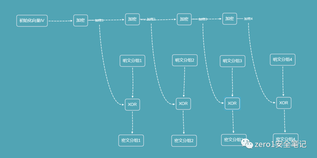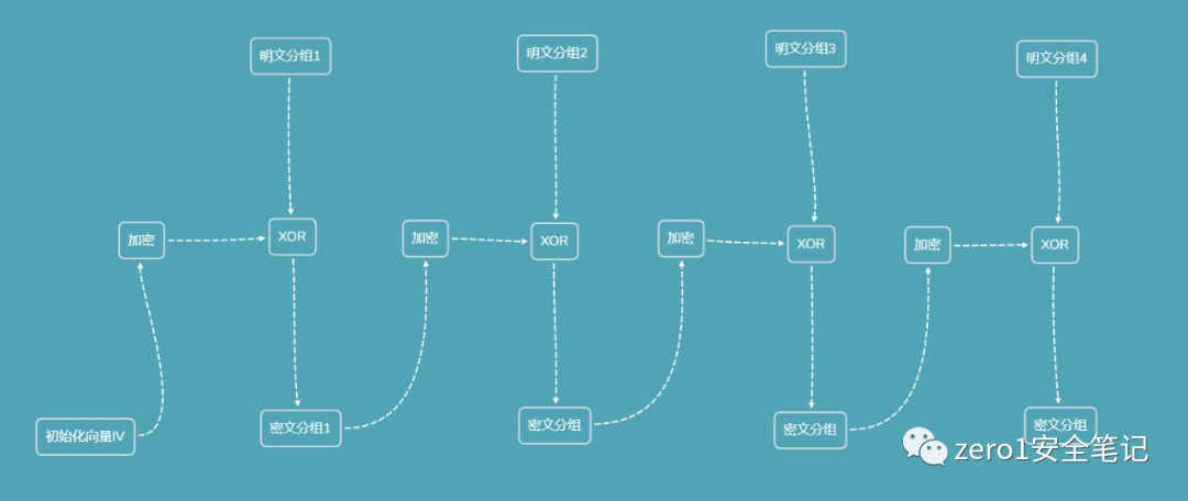 初始化向量:当加密第一个明文分组时,由于不存在前一个密文分组,因此需要准备一个长度为一个分组的比特序列来代替前一个密文分组,这个比特序列称为初始化向量(通常缩写为IV),一般都会随机生成一个比特序列作为初始化向量。
