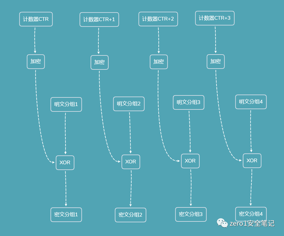 CTR模式的全称是CounTeR模式(计数器模式),该模式是一种通过将逐次累加的计数器进行加密来生成密钥流的流密码。CTR模式中,每个分组对应一个逐次累加的计数器,并通过计数器进行加密来生成密钥流,最终的密文分组是通过将计数器加密的比特序列,与明文分组进行XOR而得到的,和CFB模式、OFB模式类似,不直接对明文分组进行“加密”。下图为加密过程: