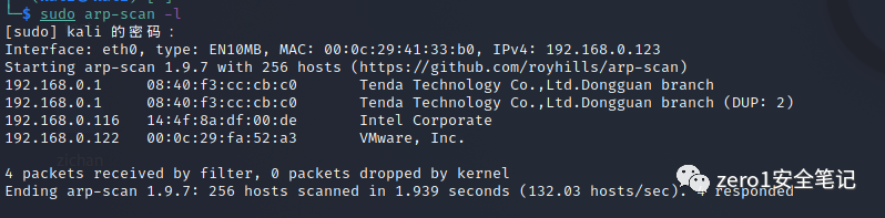 arp扫描发现存活主机:192.168.0.122