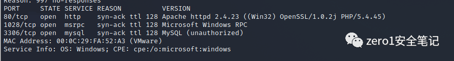 端口扫描,发现开放80、1028和3306三个端口,数据库大概率是MySQL。