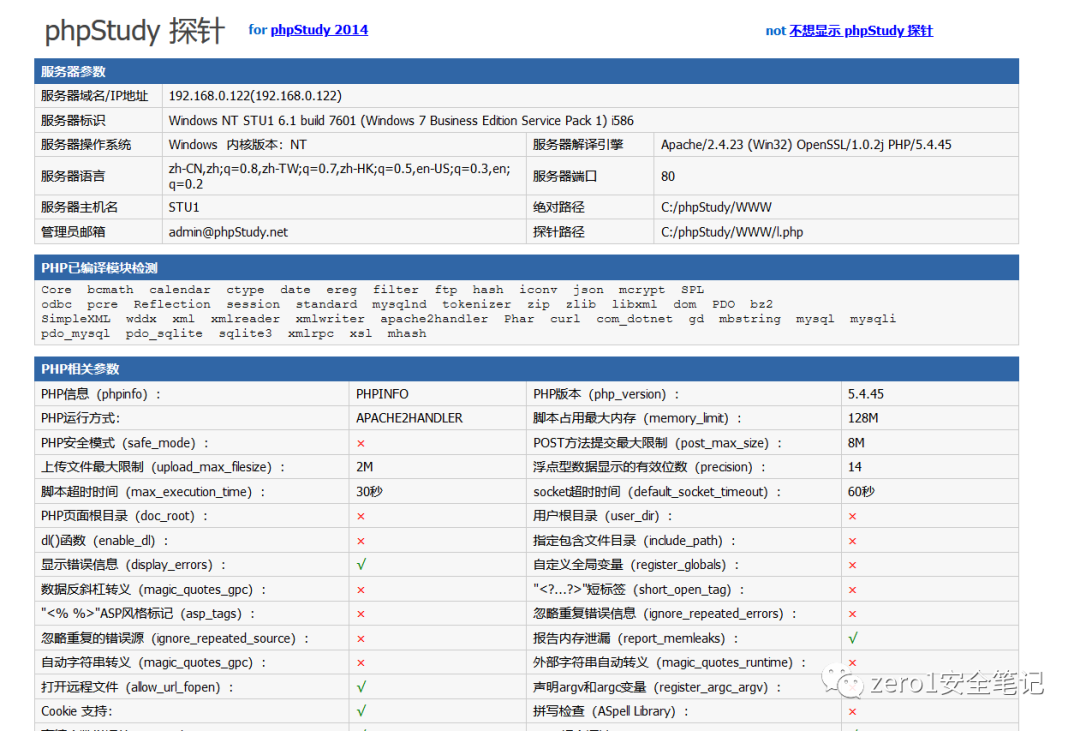 访问192.168.0.122,出现phpstudy探针页面,收集一下敏感信息,例如绝对路径。