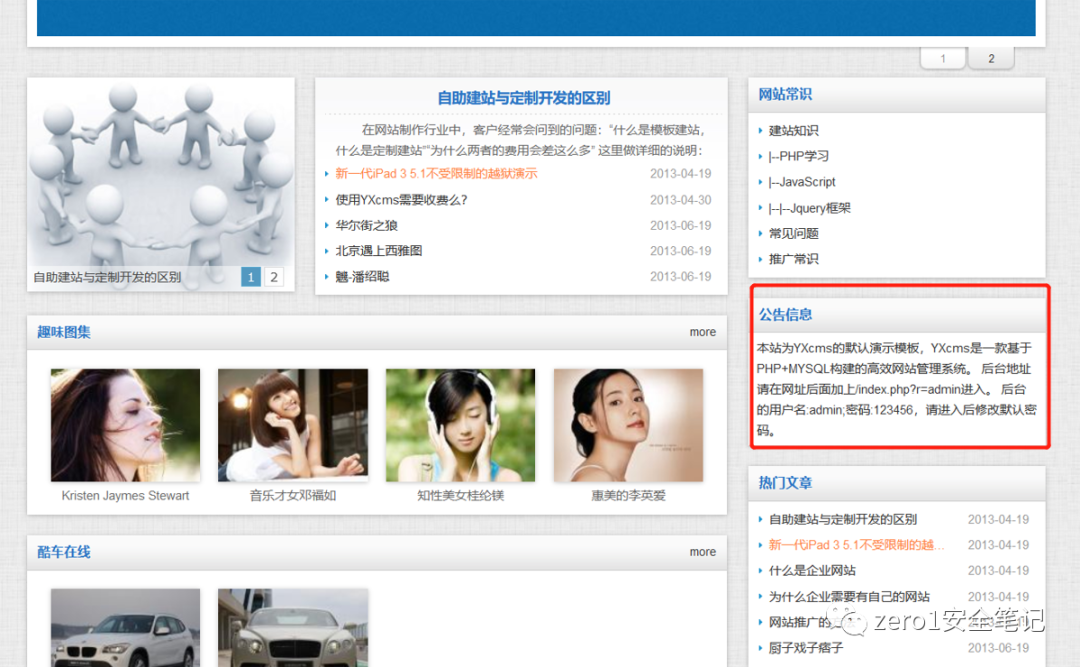 访问网站首页:http://192.168.0.122/yxcms,发现公告信息处存在网站后台地址以及账号密码。