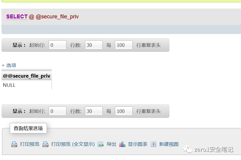 secure_file_priv为null 表示不允许导入导出secure_file_priv指定文件夹时,表示mysql的导入导出只能发生在指定的文件夹secure_file_priv没有设置时,则表示没有任何限制写入文件的时候还注意php.ini里面gpc是否开启,开启的情况下,特殊字符都会被转义 ' 变成 \'