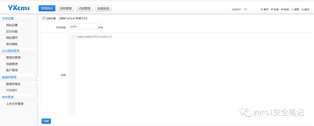 在前台模板处发现可以创建php文件,写入一句话木马,创建shell1.php。