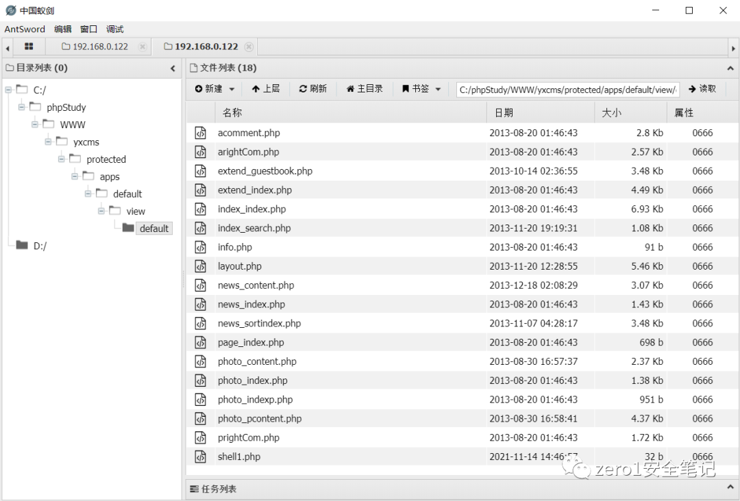 这边卡了一下,没有找到绝对路径,试了抓包、查看site map也没发现,后来想起来了备份文件里面源码应该存在路径,搜索一个之前已经存在的模板文件,查看路径进行拼接,连接蚁剑,ok,渗透的本质就是信息收集。