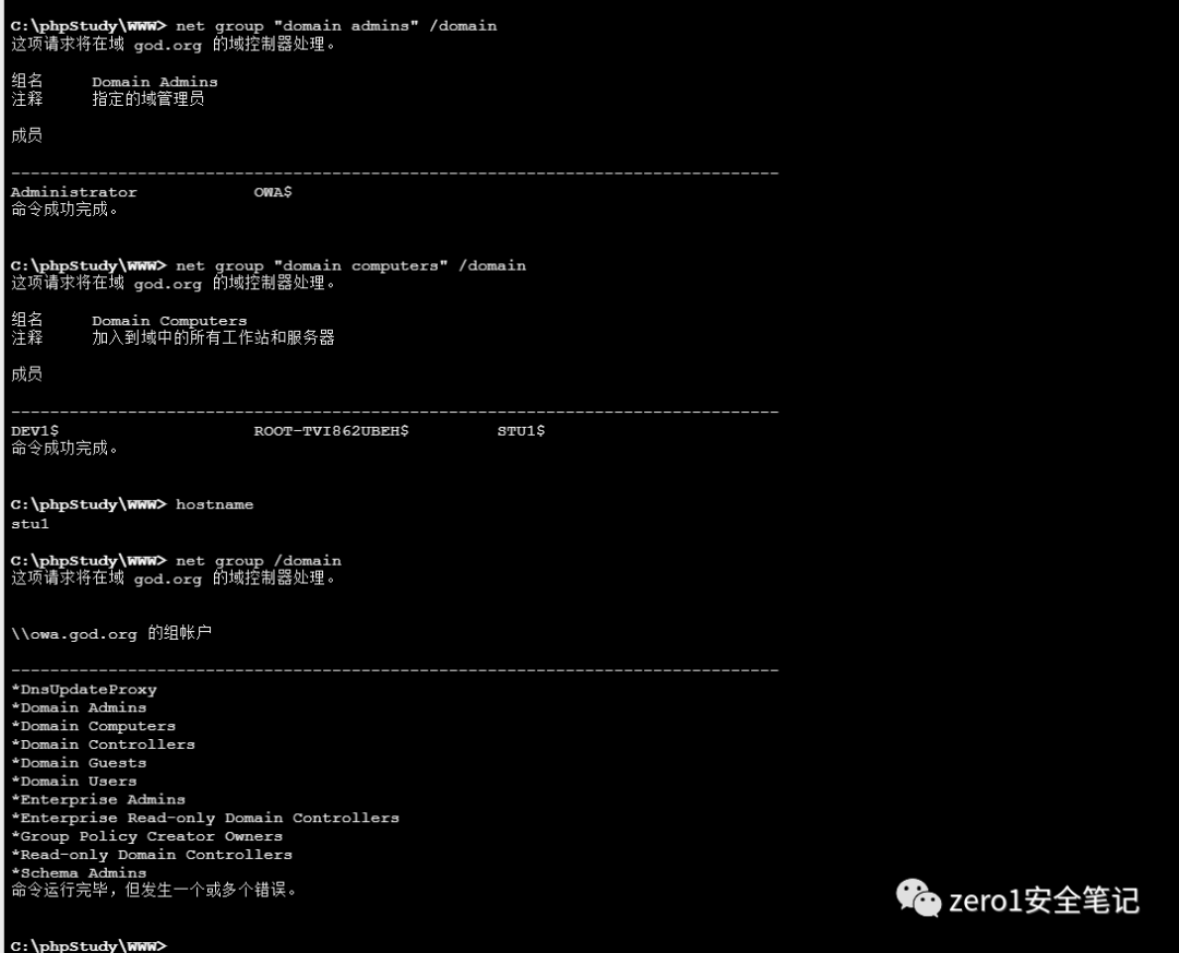 net group /domain 域内用户列表net group "domain computers" /domain 域内计算机列表net group "domain admins" /domain 域内管理员列表hostname 本机名称