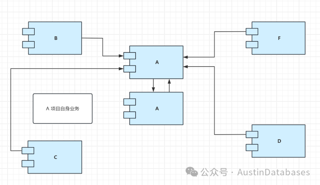 如上图,如果 B C D F 项目不讲究,经常推送大事务,突发事务,DELETE 操作等给A项目,造成A库承担了太多的业务属性,那么首先就要祭出拆分法。