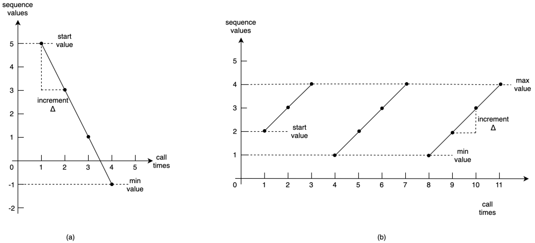 Sequence 对象在当前值的基础上进行递增或者递减,当前值被初始化为初始值